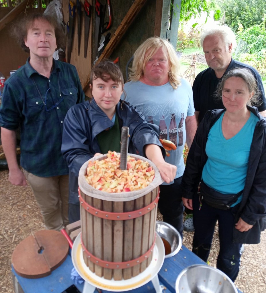 Whilst some of us picked the fruit fresh from the tree, Cerys, Luke and Claire collected the fallen apples and sorted them for compost or pressing. They also had a little help from Lottie the cat.